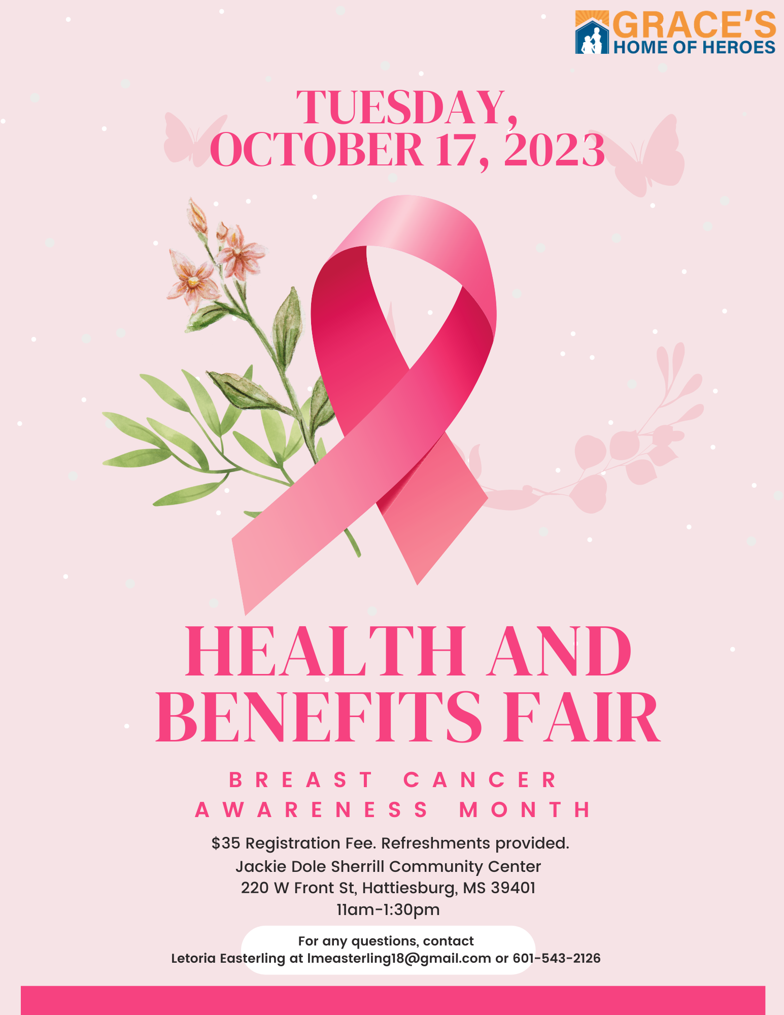 Grace’s Home of Heroes is hosting its annual Health and Benefits Fair: Breast Cancer Awareness event. The event provides a number of resources to the community that include but are not limited to legal services; housing and rental assistance, mental health services, and food pantry resources. This event is free to the public and we are asking that you come out and join us for fun and free information to help benefit the community.
