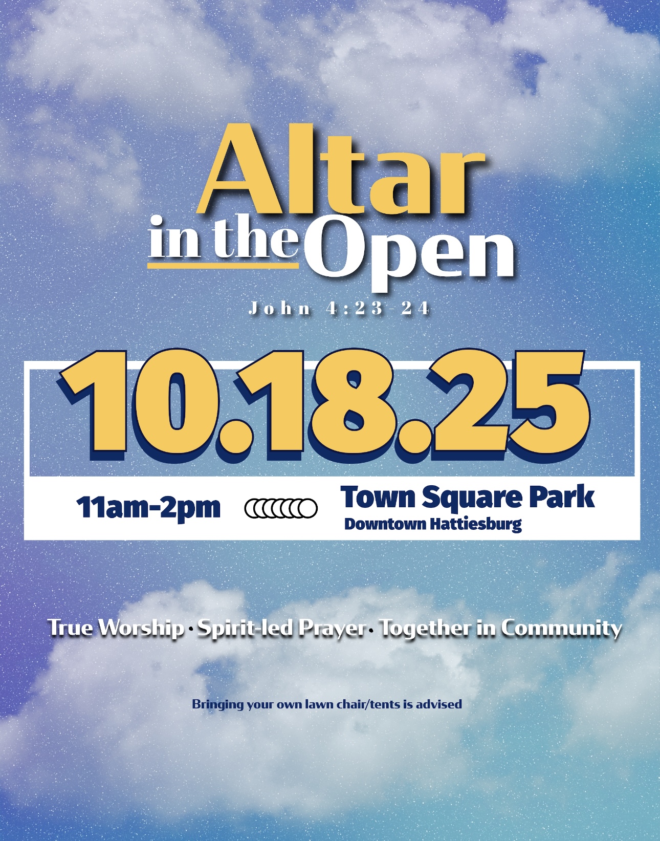Join the community for Altar in the Open on Saturday, October 18, 2025, from 11 a.m. to 2 p.m. at Town Square Park. This citywide gathering is dedicated to prayer, worship, and seeking God’s presence together. Designed to foster unity, encouragement, and peace, the event invites all to come together in a spirit of faith and hope for our city’s future.