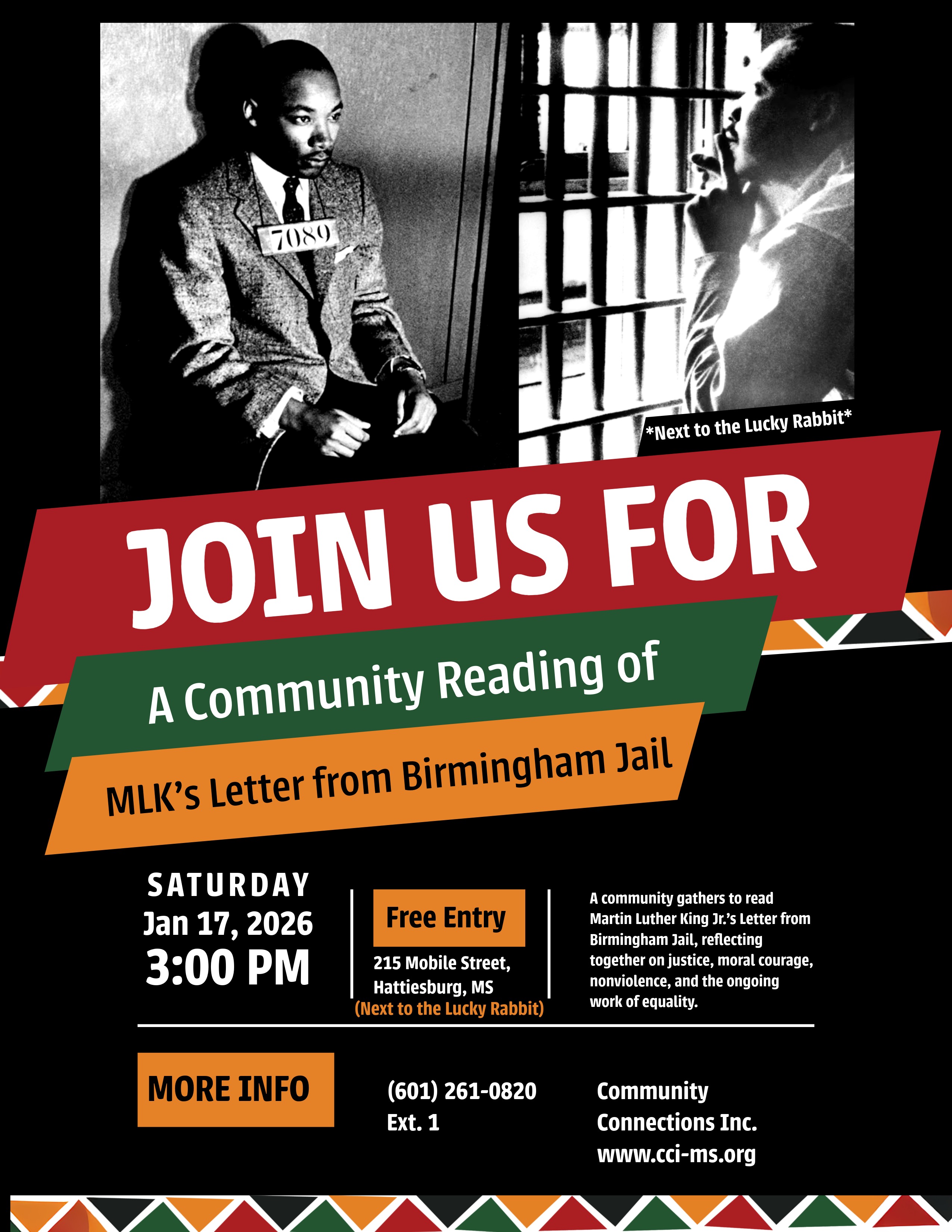 Join Community Connections Inc. and the Hattiesburg community for a reading of Martin Luther King Jr.’s Letter from Birmingham Jail as we reflect together on justice, moral courage, nonviolence, and the ongoing work of equality.