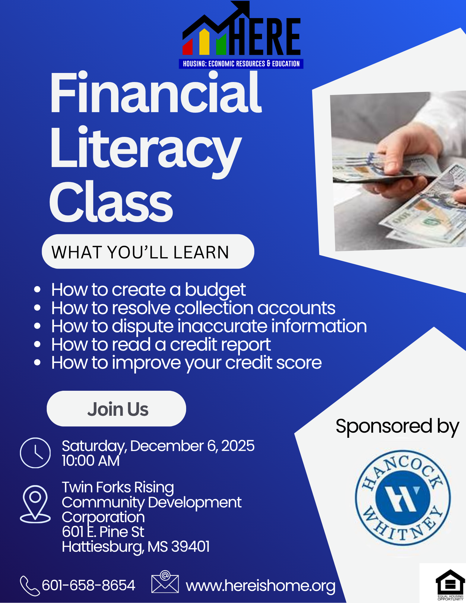 Join H.E.R.E (Housing- Economic Resources and Education) on Saturday, December 6 at the Twin Forks Rising Community Center for a free Financial Literacy Class designed to help you take control of your money and build a stronger financial future. Participants will learn how to create a budget, resolve collection accounts, read a credit report, and improve their credit score.