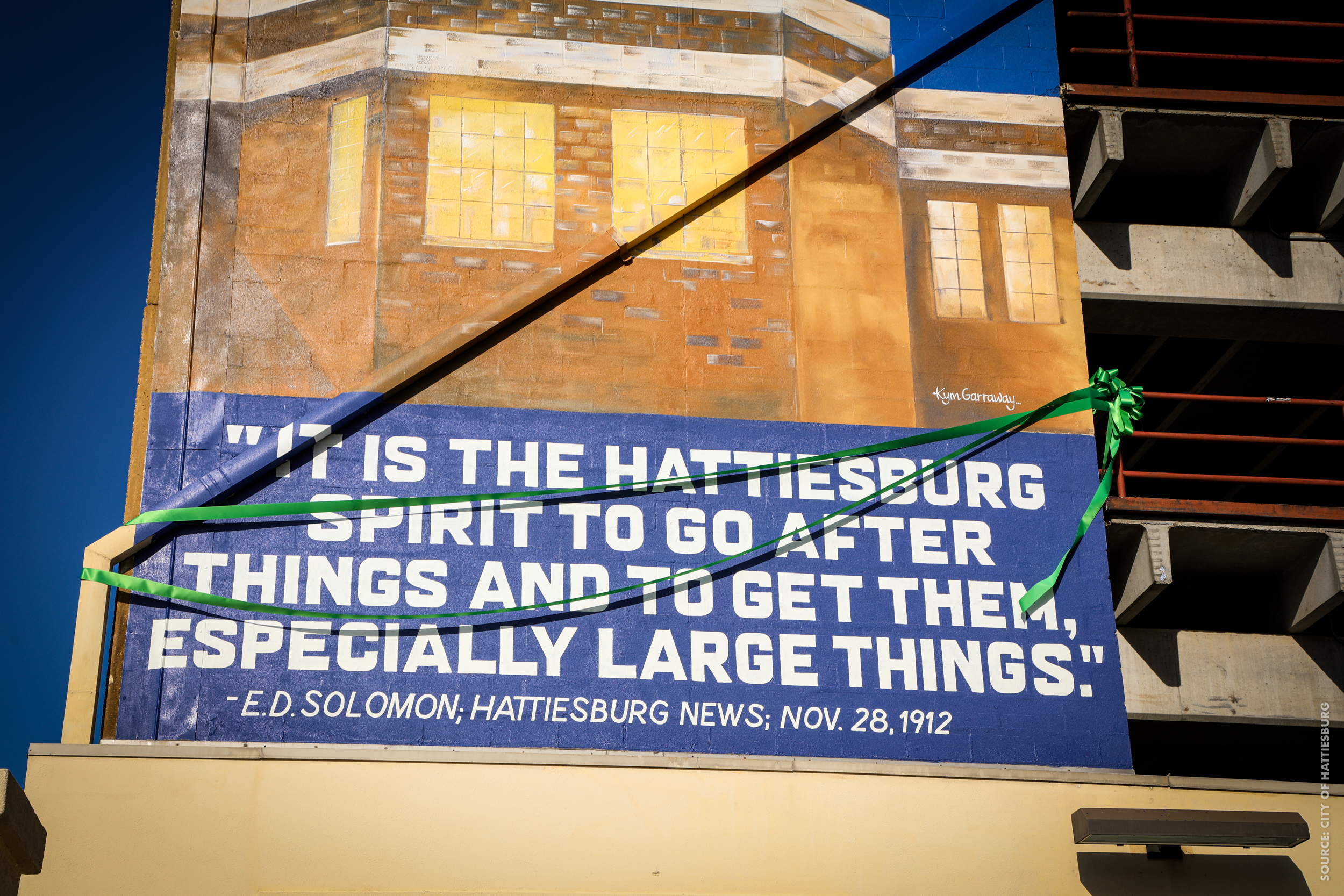 The quote that accompanies the mural was hand-painted by Prince who is well-known for his free-hand lettering styles which can be seen on the mural outside of T-Bone’s on Hardy Street and the Smile Mural on Mobile Street. The quote, “It is the Hattiesburg spirit to go after things and to get them, especially big things.” was stated by Reverend E.D. Solomon, a local pastor who spoke at the 1912 celebration when the sign was presented and lit. According to Barker, it holds a special meaning and serves as a challenge for all residents and visitors.